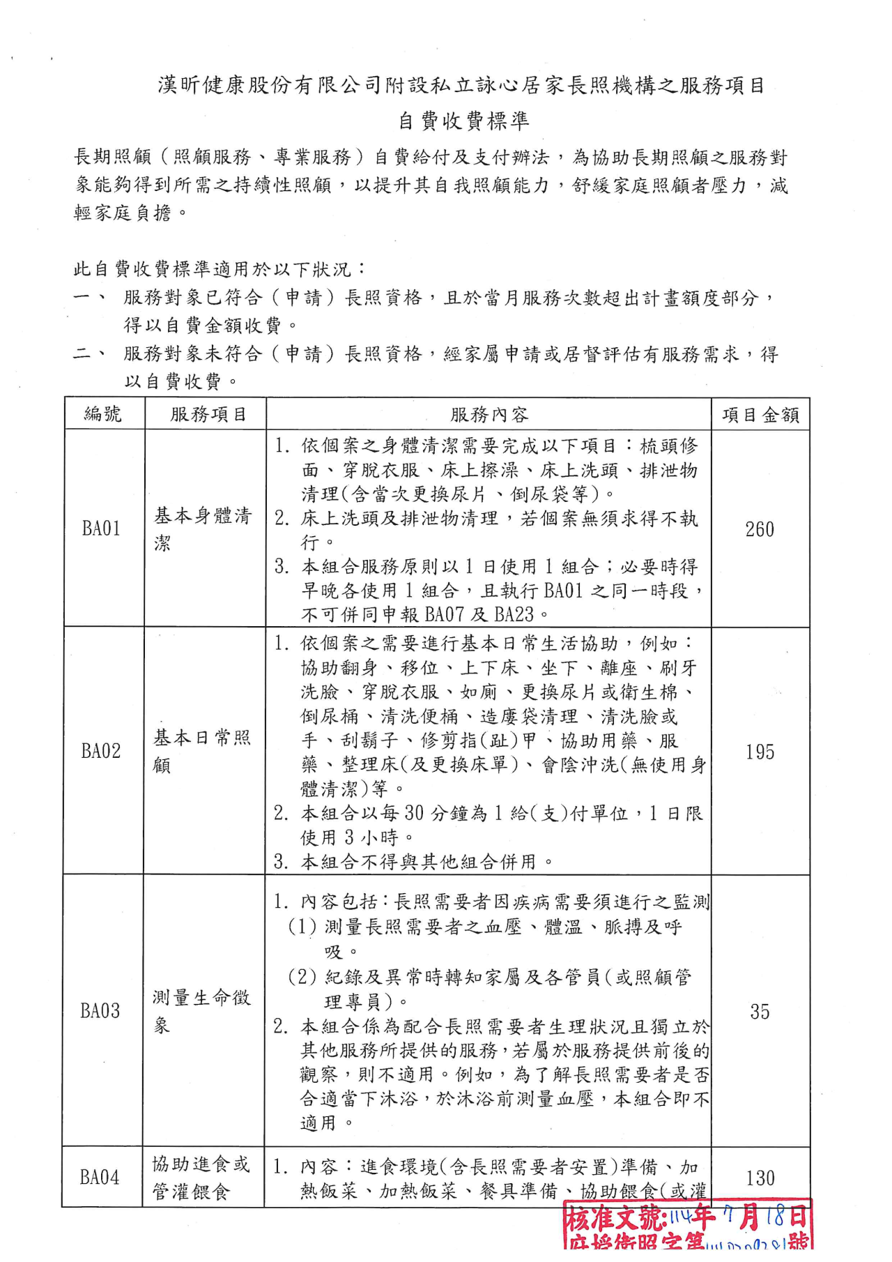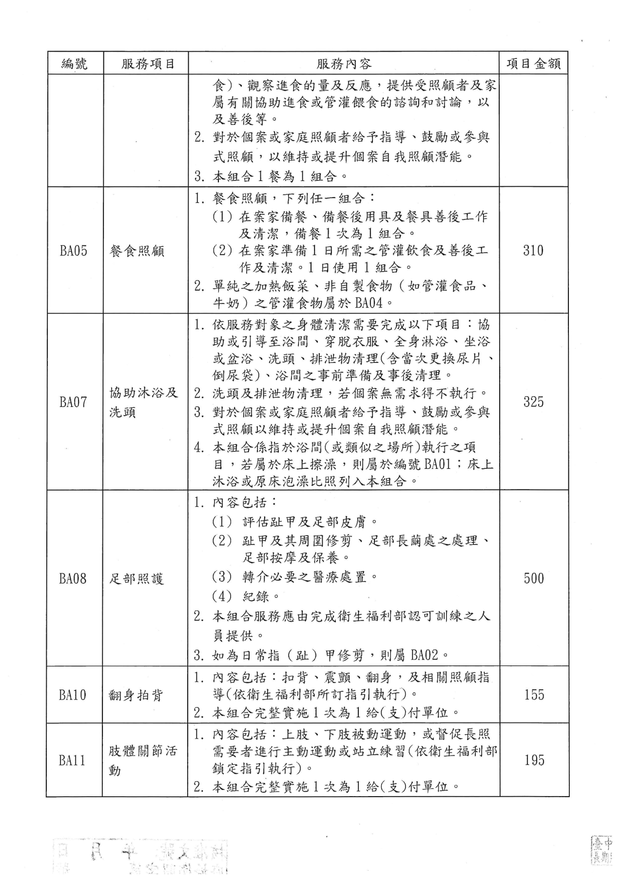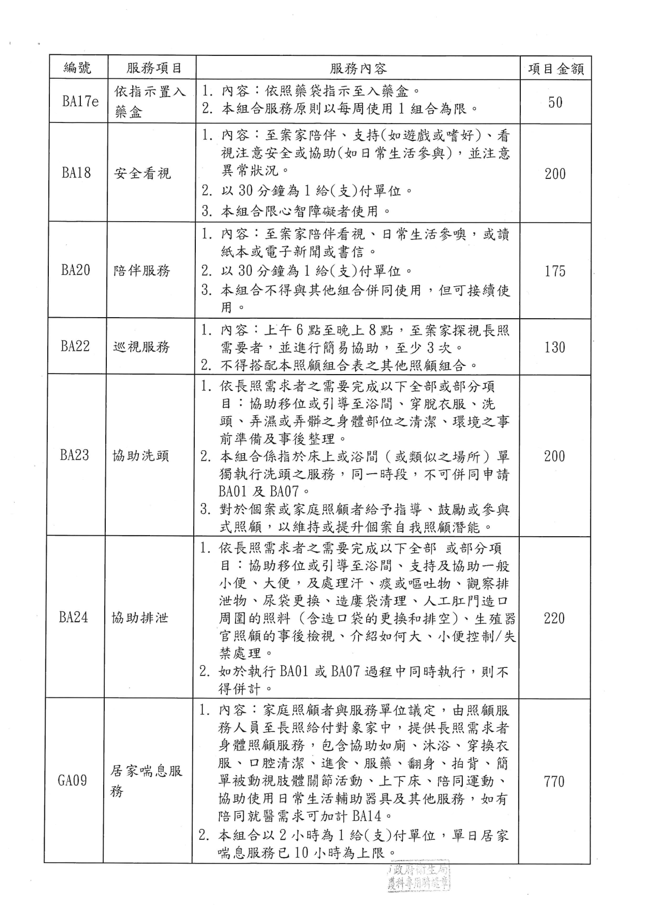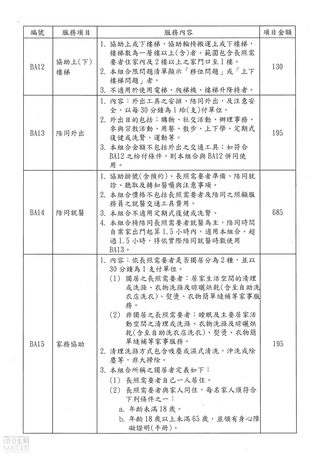 BA12 | 協助上(下)樓梯 | 130 | 20 | 6 | BA22 | 巡視服務 | 130 | 20 | 6 |