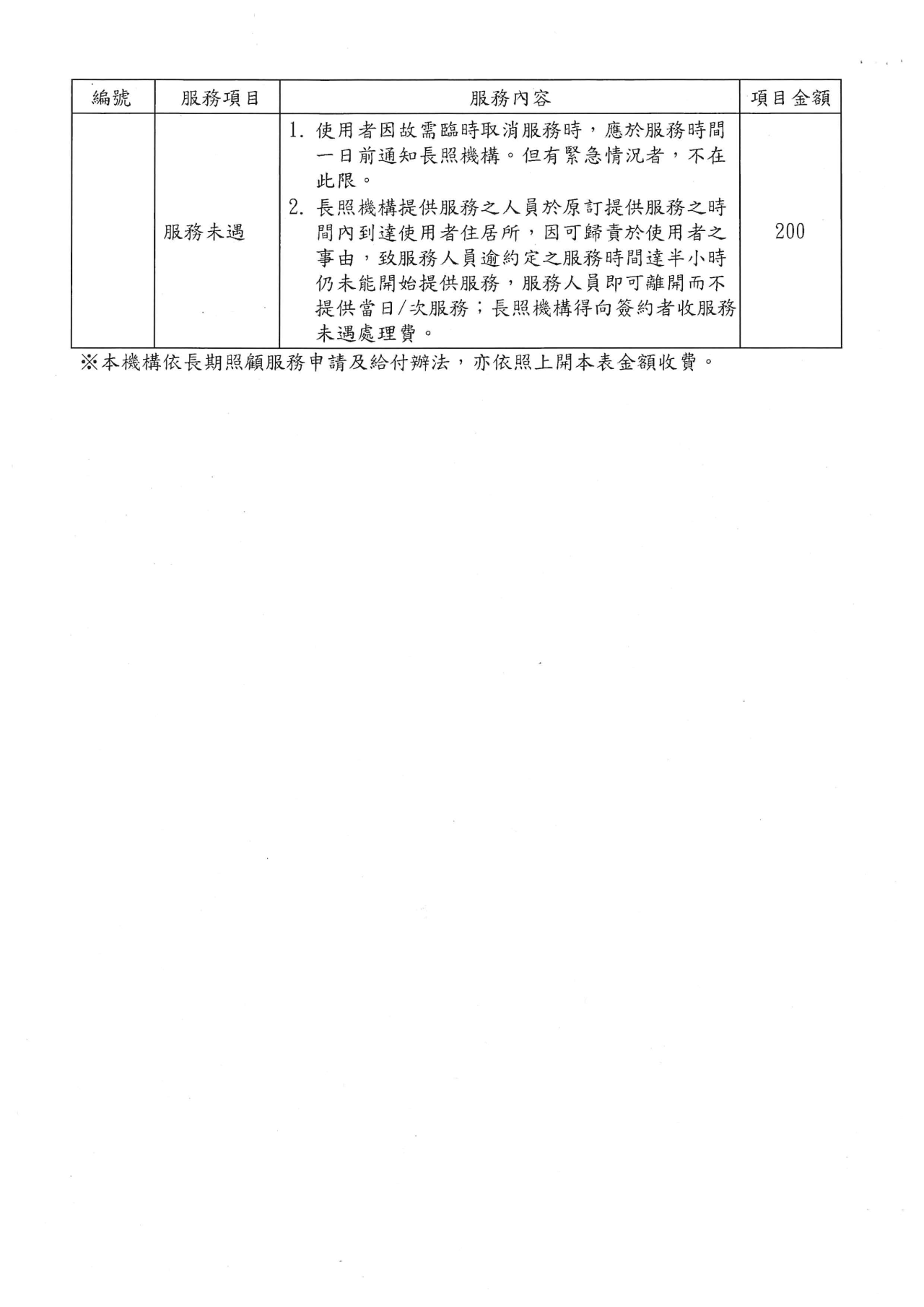 編號 | 服務內容 | 自費金額 | 一般戶 | 中低收 | 編號 | 服務內容 | 自費金額 | 一般戶 | 中低收 |