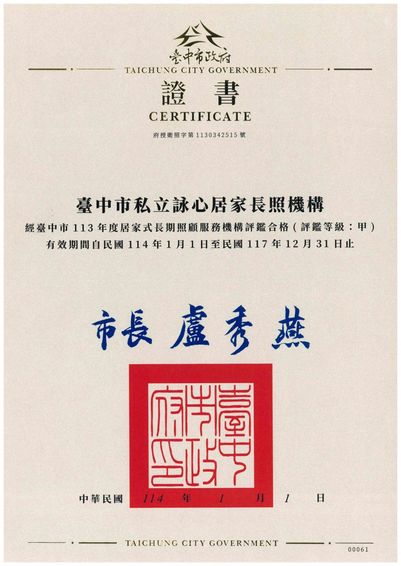 詠心是一個非常專業且年輕有活力的居家長照單位,機構訴求對外除了秉持「以人為本、專業團隊、科技應用、社區參與」四大主軸的經營理念外,尚需具備三心「細心、耐心、同理心」的態度來服務每位長照服務使用者;
