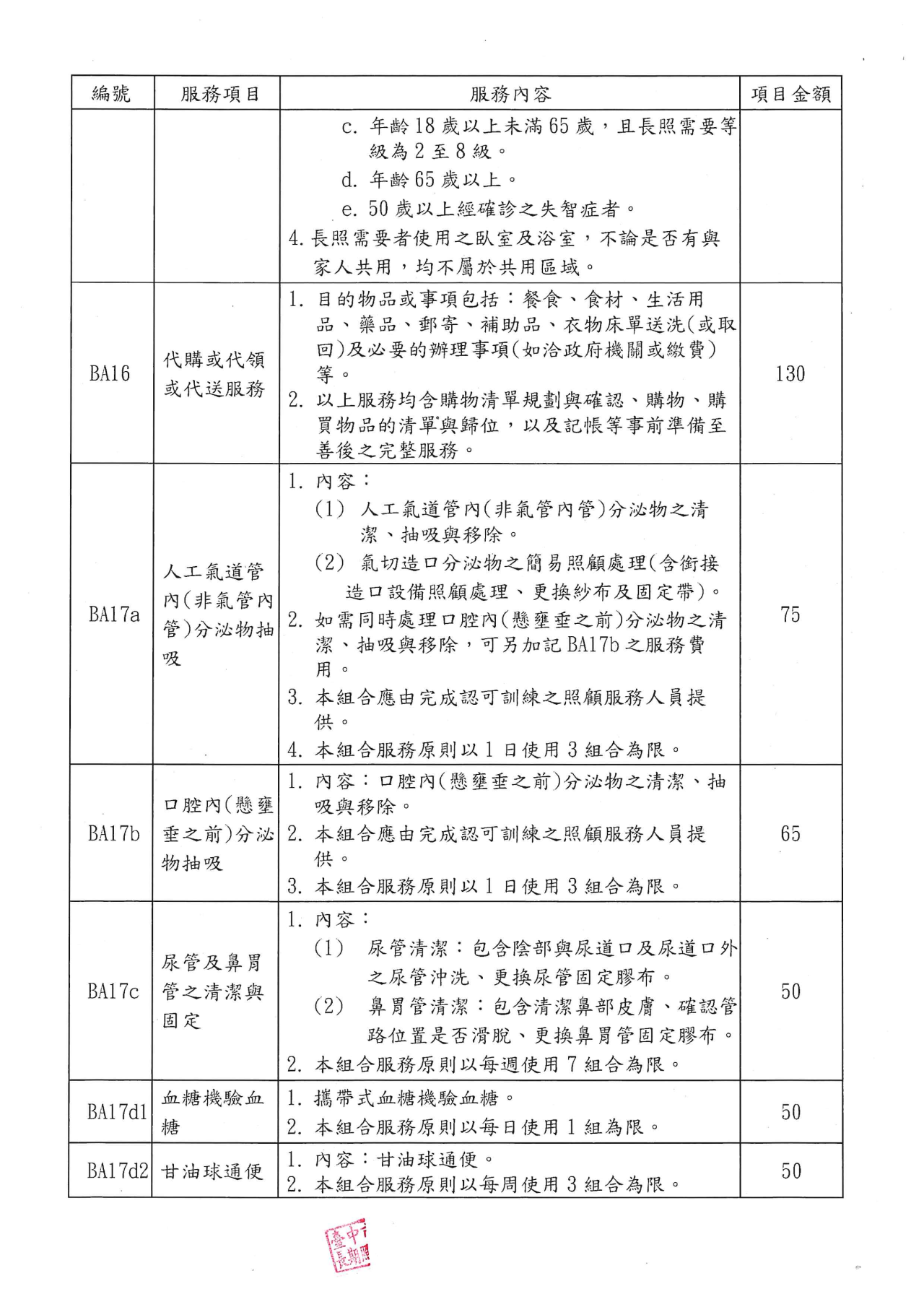BA01 | 基本身體清潔 | 260 | 41 | 13 | BA16 | 代購或代領或代送服務 | 130 | 20 | 6 |