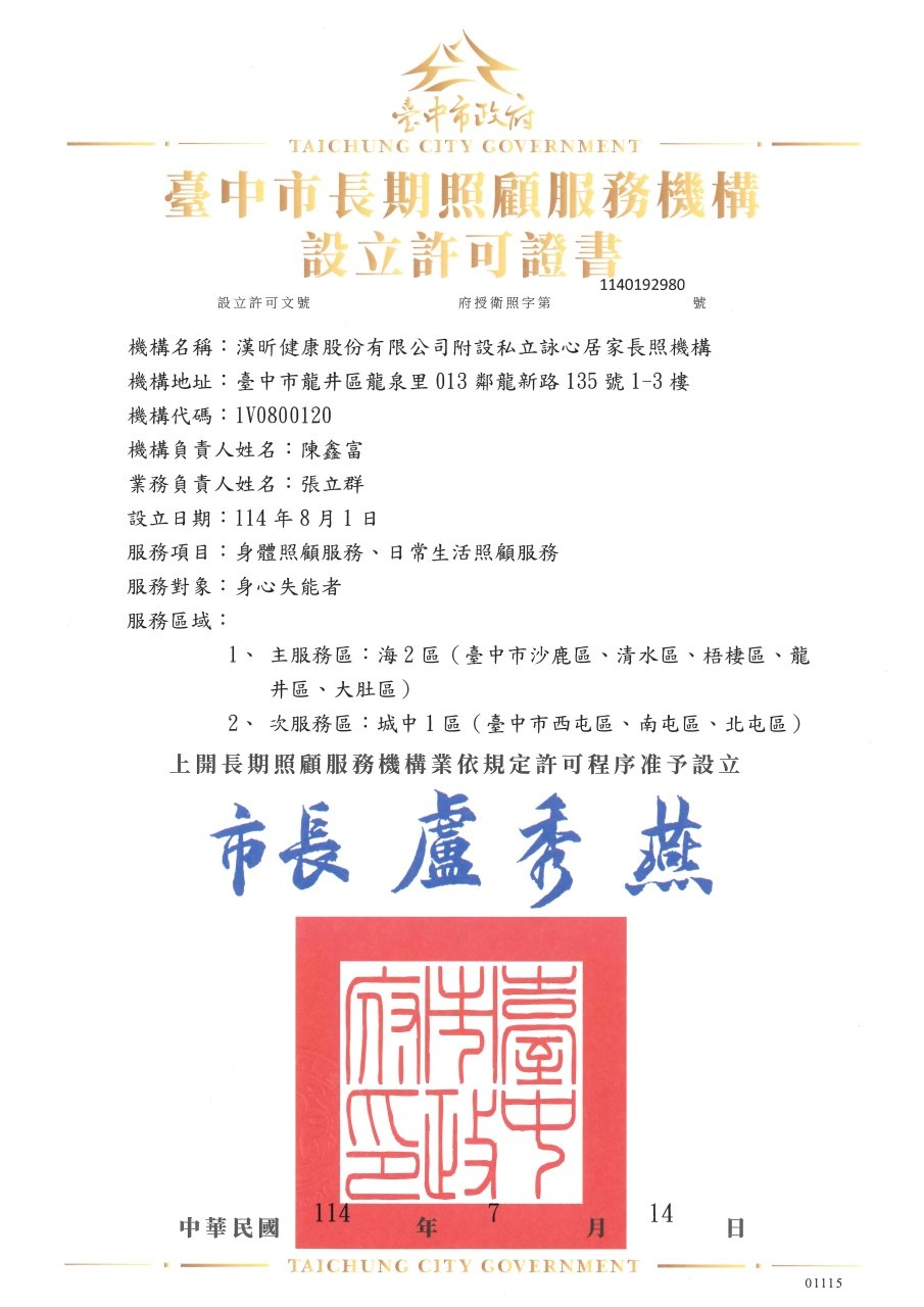漢昕健康股份有限公司附設私立詠心居家長照機構