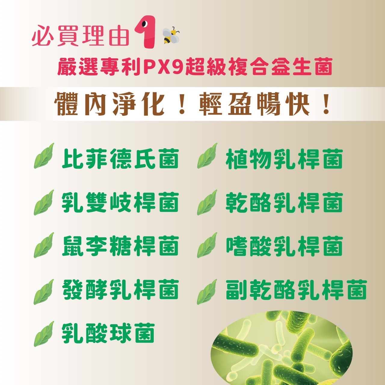 蜂蜜提取物(蜂蜜、果寡糖、玉米澱粉)、異麥芽寡糖、水溶性膳食纖維、PX9益生菌 (Bifidobacterium bifidum BB2,Bifidobacterium lactis BL7,Lactobaillus casei LC6,Lactobacillus plantarum BB9,Lactobacillus rhamnous BB1,Lactobacillus acidophilus,Lacobacillus fermentum,Lactobacillus paracasei,Lactococcus Lactis subsp.Lactis)、鳳梨酵素、蘋果酸。 |