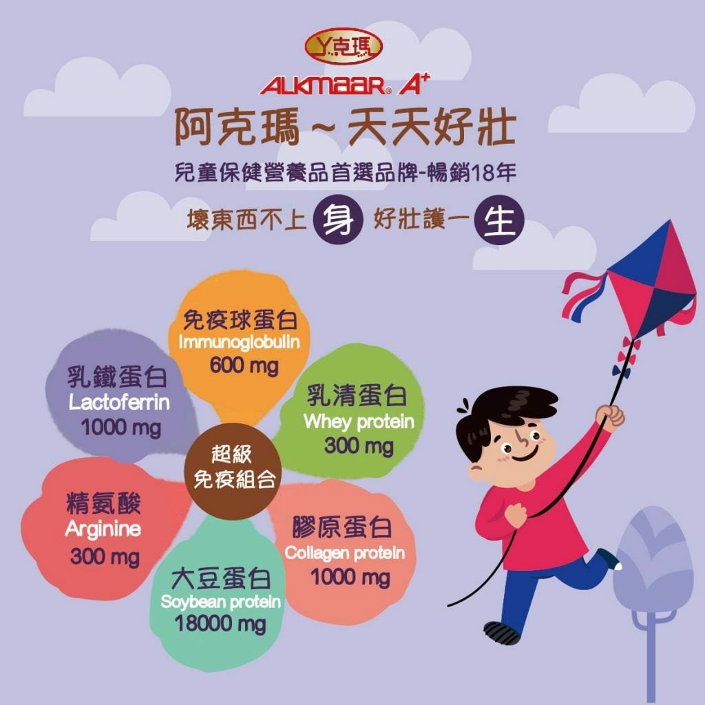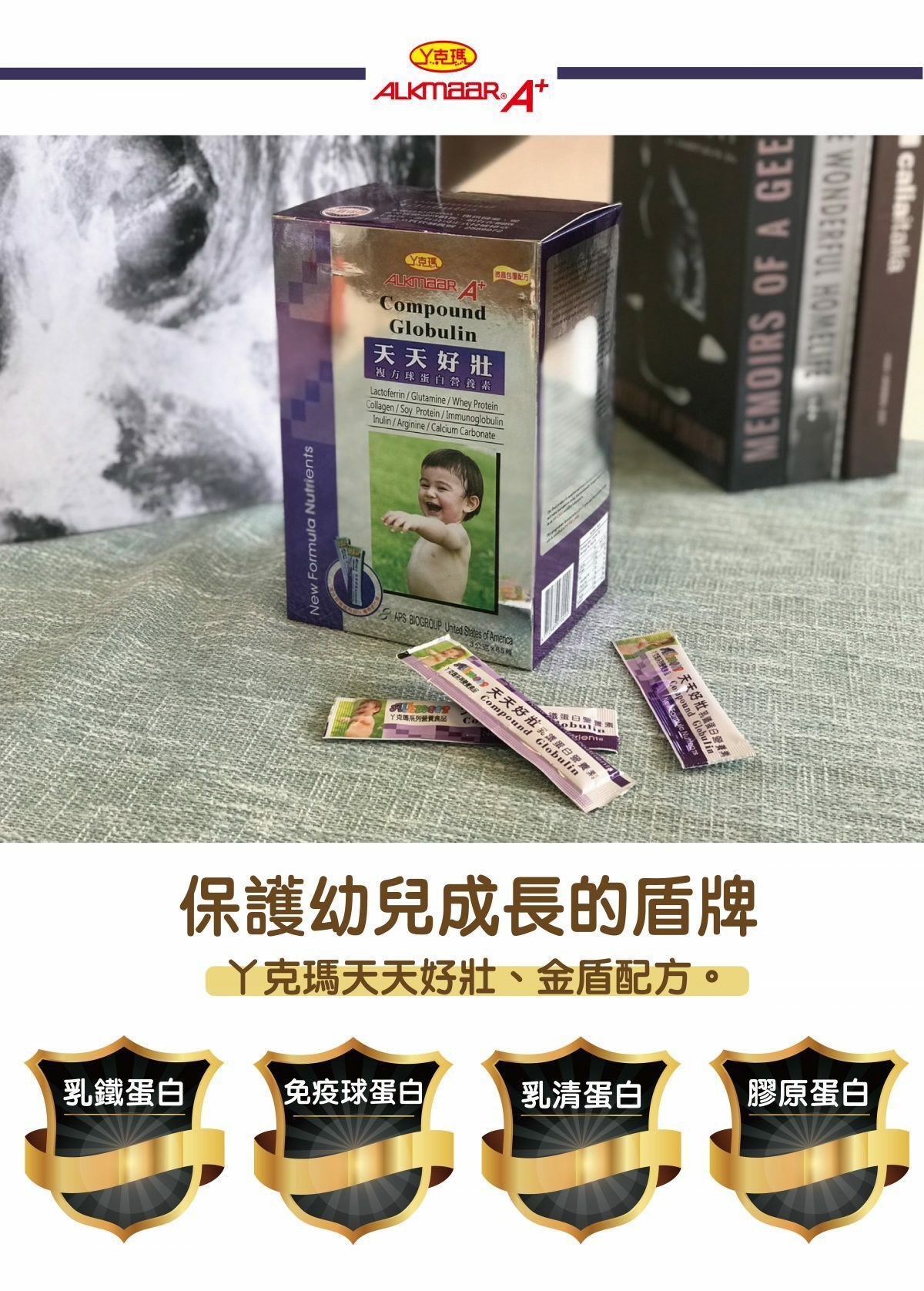 本產品為複方綜合球蛋白營餐養素,含珍貴的牛初乳免疫球蛋白、乳鐵蛋白、膠原蛋白,添加多種球蛋白營養素,結合人體必須的麩醯胺酸,可調整體質,幫助寶寶健康成長。 |