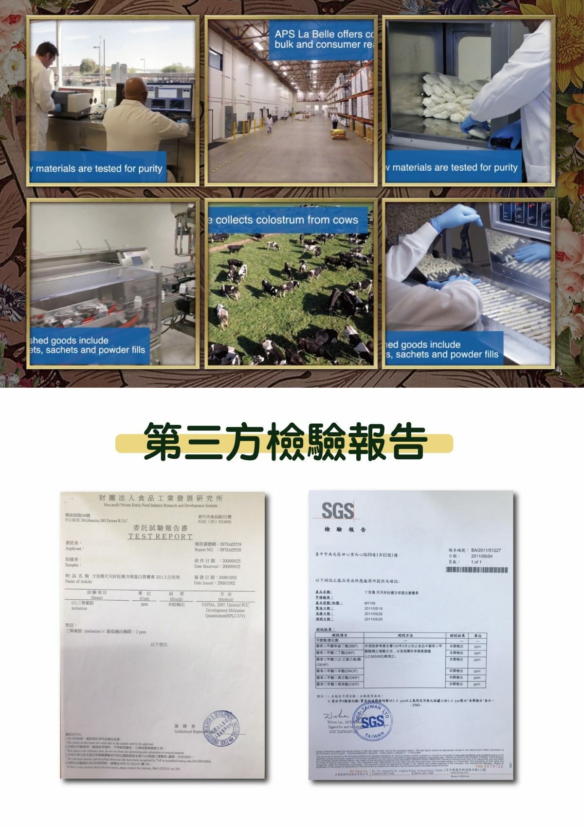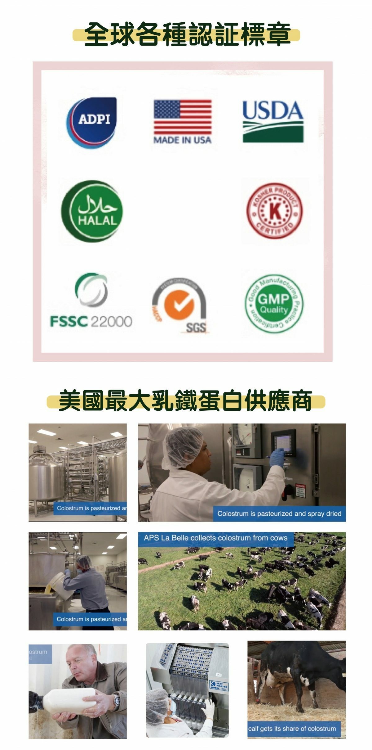 葡萄糖、乳糖、麥芽糊精、膳食織維、乳鐵蛋白(牛初乳提取)、免疫球蛋白、黏多醣蛋白、乳清蛋白、膠原蛋白、乳清胜肽、楓糖、麥芽粉、葡萄皮萃取、精胺酸、麩醯胺酸。 |
