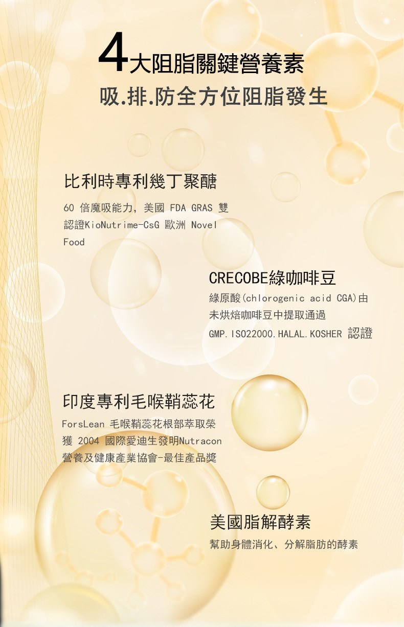 比利時幾丁聚糖、毛喉鞘蕊花萃取物(毛喉鞘蕊花萃取物、麥芽糊精)、綠咖啡萃取物、美國脂解酵素。 |