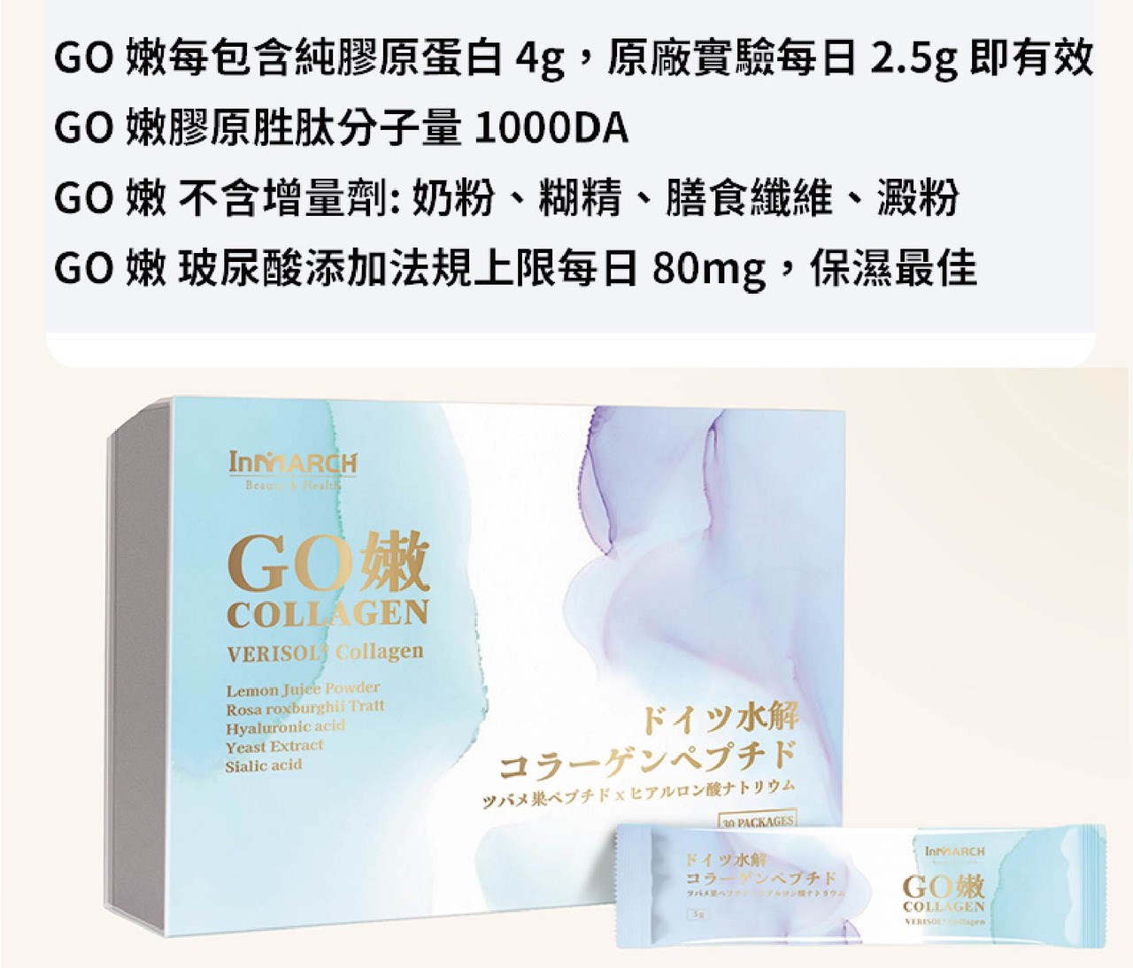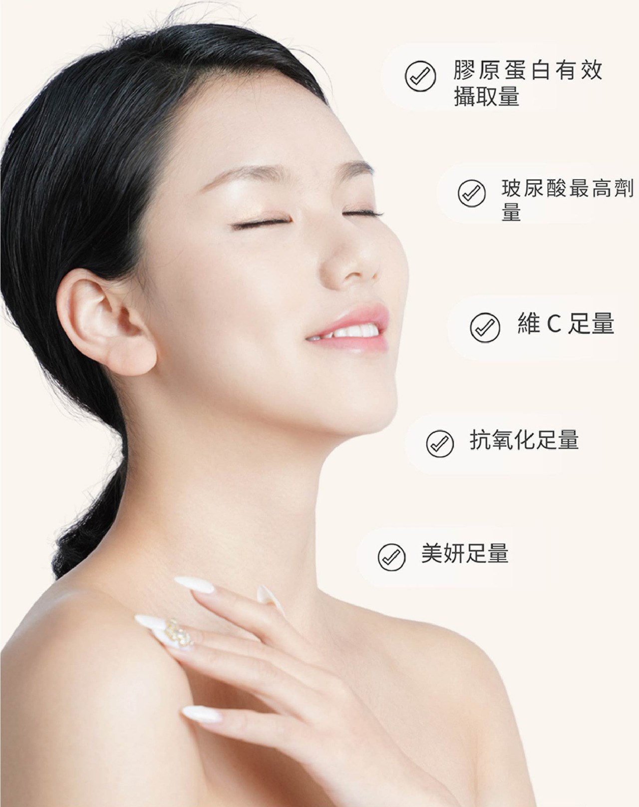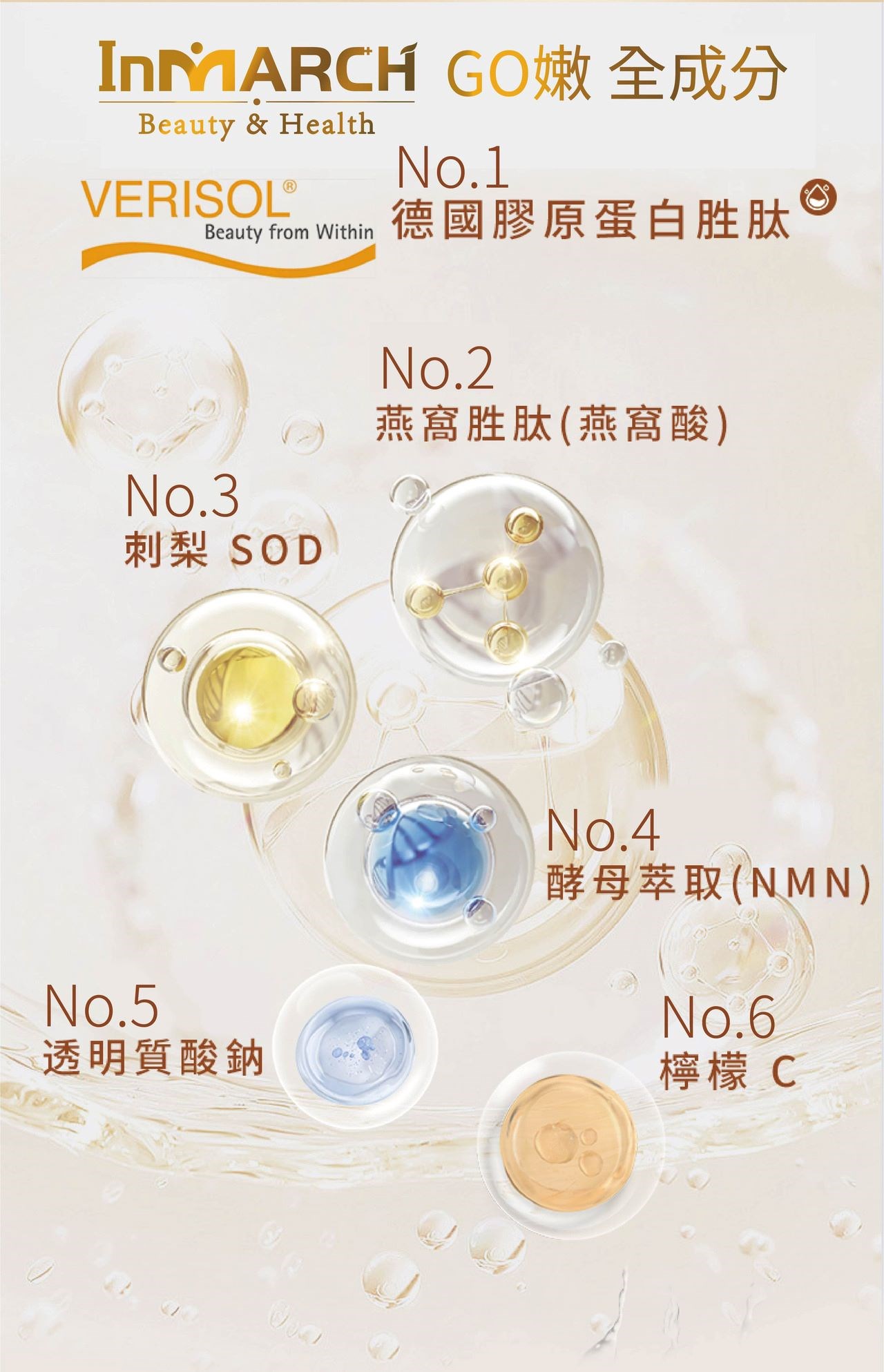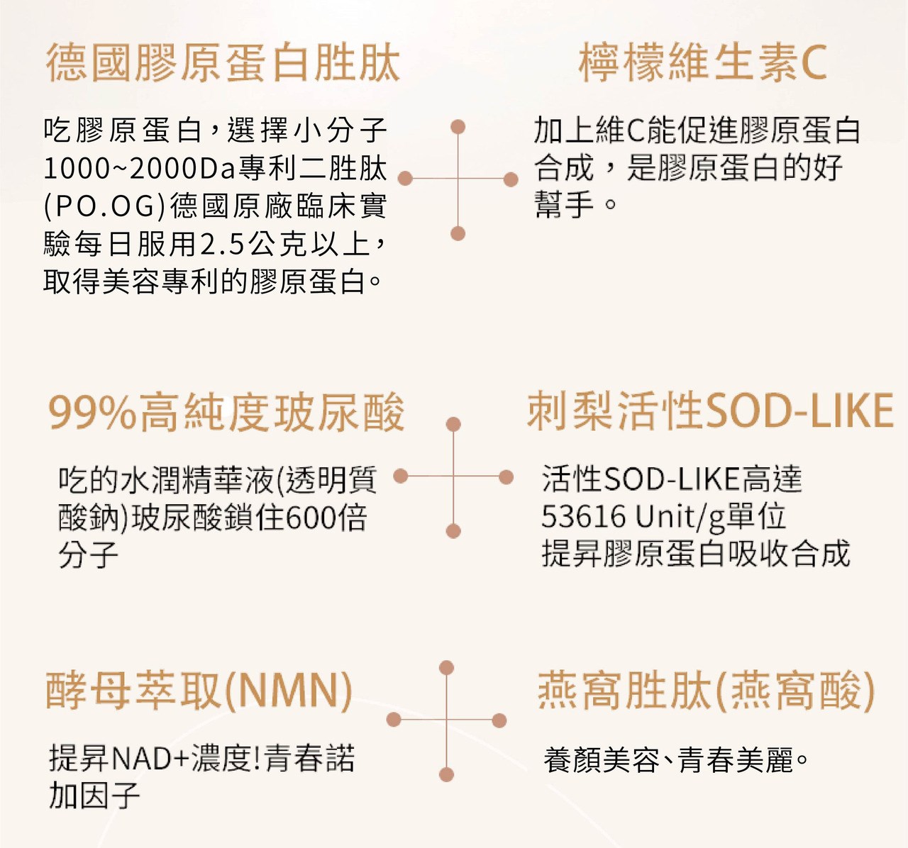 VERISOL德國水解膠原蛋白胜肽、檸檬果汁粉(砂糖、麥芽糊精、檸檬原汁、麥芽糖漿(玉米澱粉(非基因改造)、水、檸檬酸、香料(天然香料、酯類)、刺梨萃取(含SOD)、透明質酸鈉(玻尿酸)、酵母萃取(含NMN)、燕窩胜肽(燕窩酸Sialic acid, SA) |