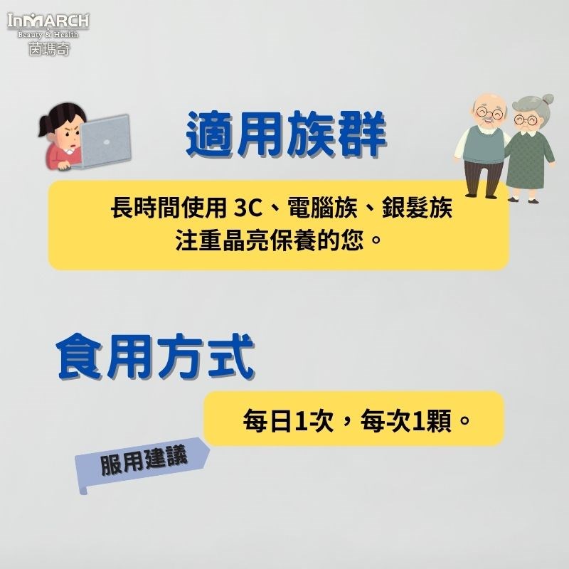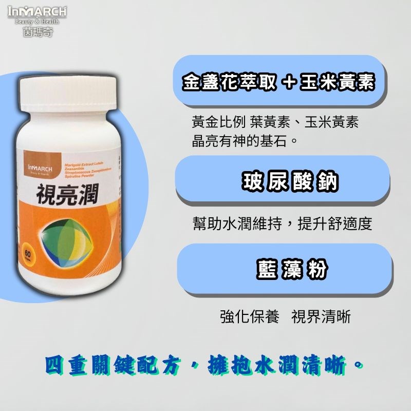 藍藻粉、流行鏈球菌發酵物(含透明質酸鈉)、金盞花萃取(葉黃素)、玉米黃素、羥丙基甲基纖維素、純水、鹿角菜膠、二氧化鈦、氯化鉀。 |